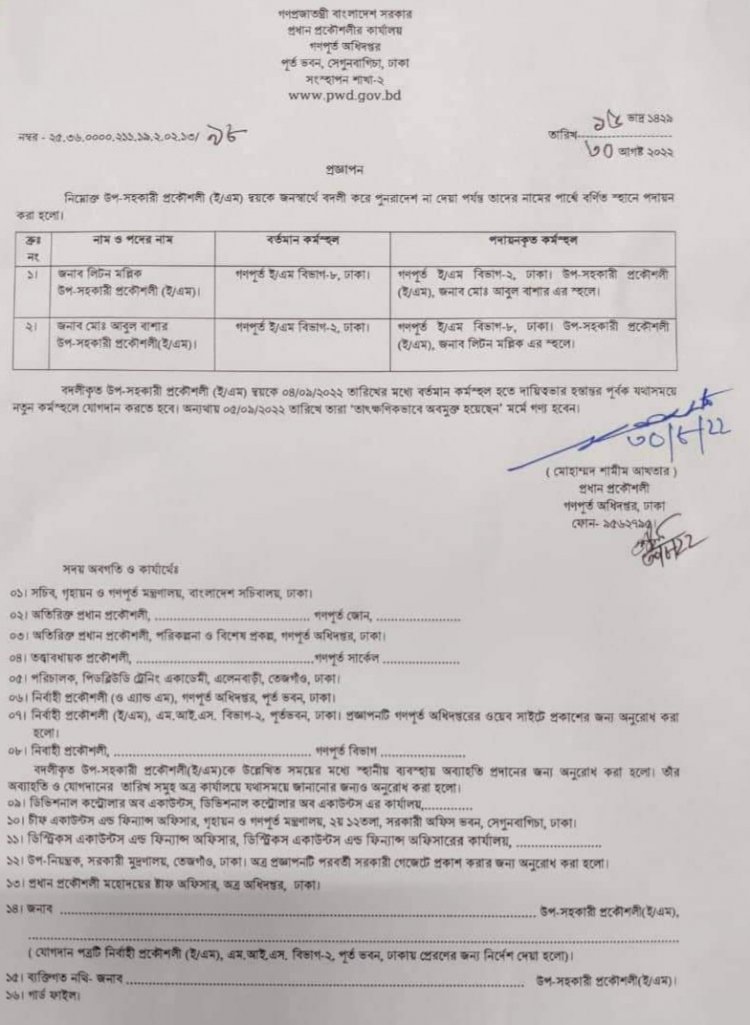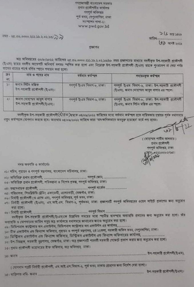 এই বছর আগস্টে মাসের ৩০ তারিখে প্রথমে তাকে গণপূর্ত ই/এম বিভাগ-৮,ঢাকা, থেকে পদলি করা হয় গণপূর্ত ই/এম বিভাগ-২, ঢাকা তে। কিন্তু তাঁর এই বদলির আদেশ কার্যকর না হতে হতেই এই আদেশটি বাতিল করে ৩১ শে আগস্টে আরেকটি নতুন প্রজ্ঞাপন জারি করে লিটন মল্লিককে আবার বদলি করা হয় গণপূর্ত ই/এম বিভাগ-৬, ঢাকা তে।