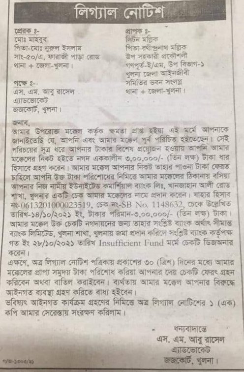 উকিল নোটিশ সূত্রে জানা গেছে বাদী মাহবুব এবং উপ-সহকারী প্রকৌশলী লিটন মল্লিক পুর্ব পরিচিত। মাহবুবের কাছে থেকে এককালীন ৩ লক্ষ টাকা ধার নেন উপ-সহকারী প্রকৌশলী লিটন মল্লিক। মাহবুব টাকা চাইলে উপ-সহকারী প্রকৌশলী লিটন মল্লিক ২০২১ সালের অক্টবোর মাসের ১৪ তারিখে তাঁর নিজ নামীয় ইউনাইটেড কমার্শিয়াল ব্যাংক লিমিটেডের খান জাহান আলী রোড শাখার হিসাব নং ০৬১৩২০১০০০০২৩৫১৯ একাউন্টের এসবি নং ১১৪৮৬৩২ চেক প্রদান করেন। কিন্তু চেকটি নগদায়ন করতে গেলে দেখা যায় উক্ত ব্যাংক একাউন্টে পর্যাপ্ত টাকা নেই।